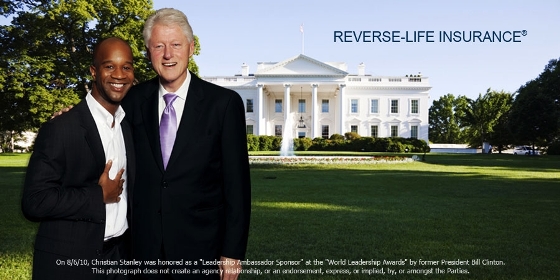 Hold on a second, is that William Jefferson Clinton? This Reverse-Life Insurance must be a fine product indeed, given President Clinton’s eager endorsement. No, wait a second. Sorry, I carelessly jumped to an unwarranted conclusion. It says at the bottom, in small font (arial blur?): “this photograph does not create an agency relationship, or an endorsement, express, or implied, by, or among the Parties.” Well, that takes care of that.